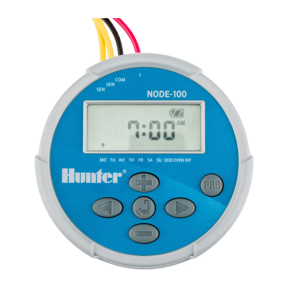 For isolated sites and power-restricted areas, the Hunter NODE is the smart, reliable solution. The NODE mounts to a valve’s solenoid quickly and easily and without screws, drills, or additional wires. The unit’s solid construction and fully waterproof exterior ensure it can handle the harsh environment of any valve box. The NODE is powered by one or two 9V alkaline batteries and provides standard or extended power throughout the season. Along with exceptional reliability, the NODE features an easy-to-program LCD screen, the ability to control a Pump Master Valve, and is faster to program with Hunter’s simple wizard with 3 programs and 4 start times per program. The array of programming options and rugged reliability make the NODE a compact but powerful irrigation controller with battery or solar power flexibility.